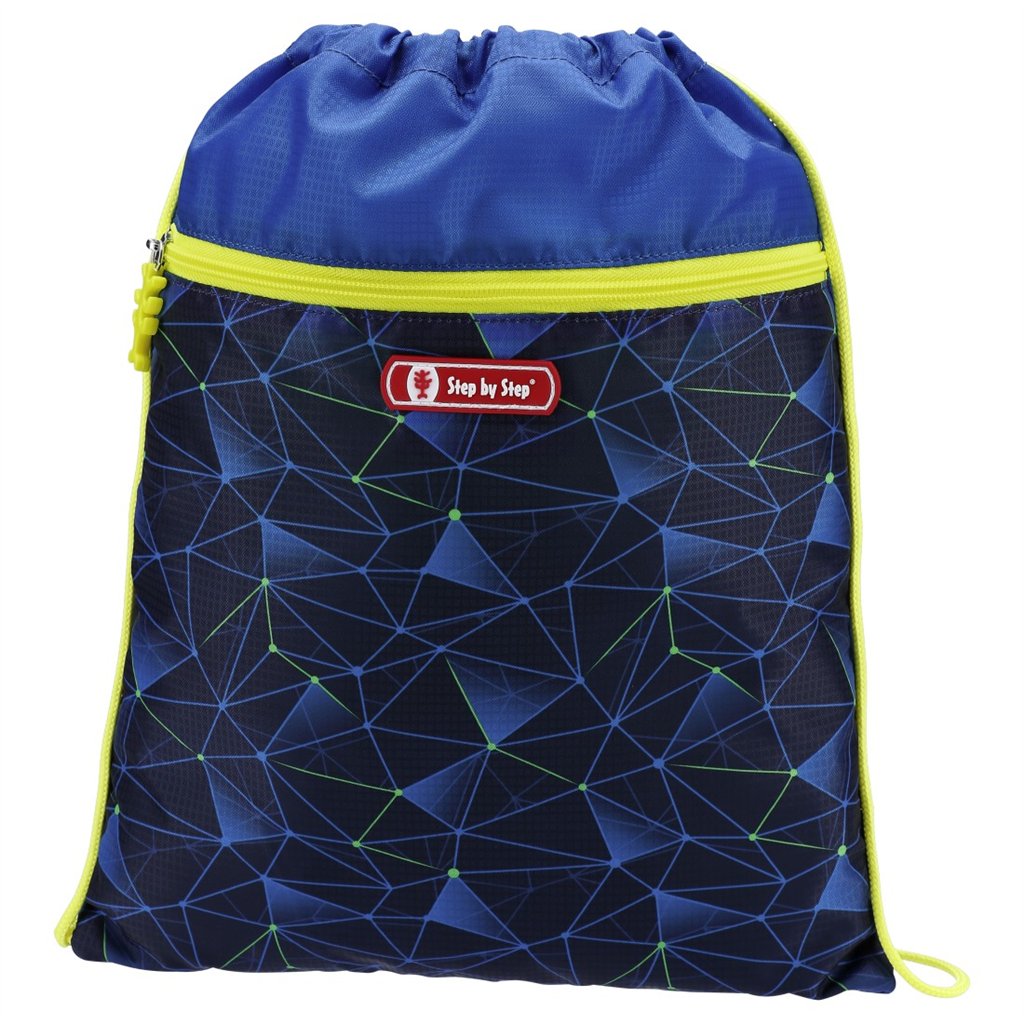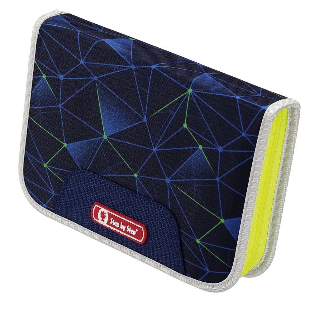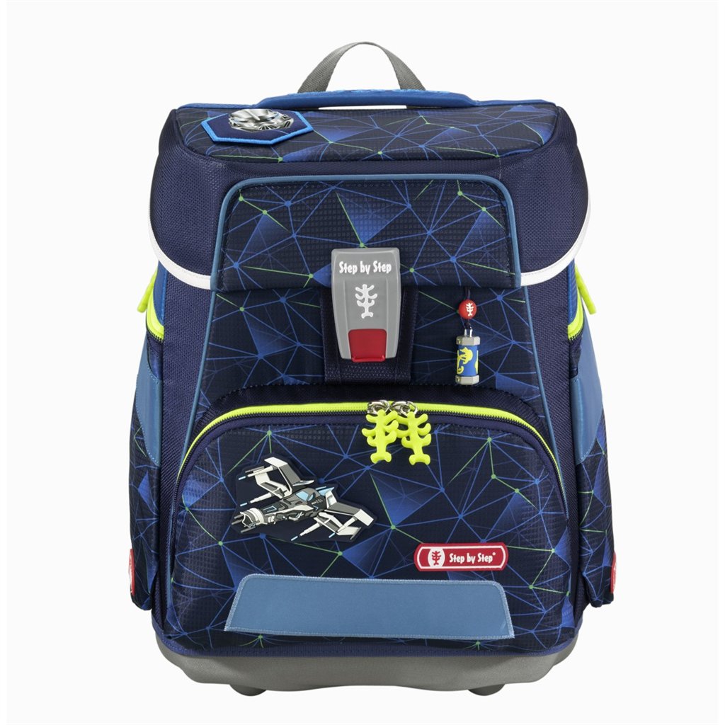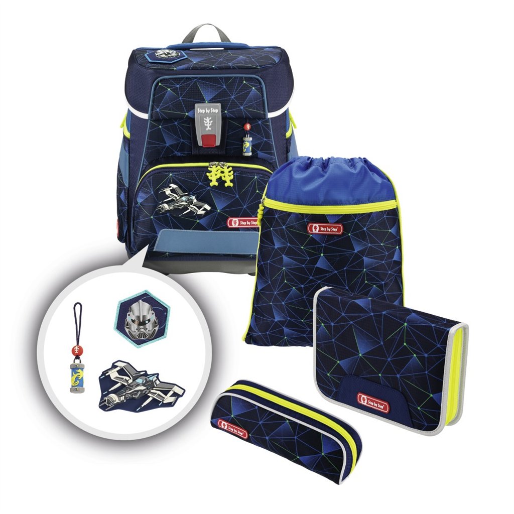 5-dílný set školních potřeb Step by Step Space v modrém provedení s Vesmírným motivem, který obsahuje: aktovku, plný penál, pouzdro, pytlík na cvičební úbor nebo přezůvky a vyměnitelné 3D obrázky Magic Mags.