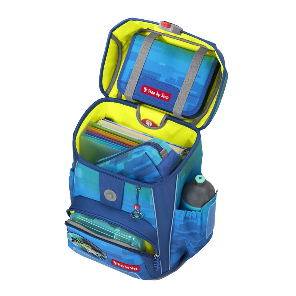 5-dílný set školních potřeb Step by Step Cloud pro prvňáčky v modrém provedení s mořským motivem, který obsahuje: aktovku, plný penál, pouzdro, pytlík na cvičební úbor nebo přezůvky a vyměnitelné 3D obrázky Magic Mags. Limitovaná edice oblíbené aktovky - aktovka a její příslušenství je vyrobeno z mořského odpadu, jeden set zbaví naše oceány o 1 kg plastového odpadu.