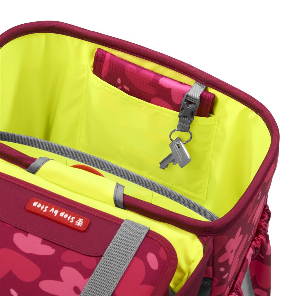 Hlavní komora batohu je prostorná a obsahuje přihrádku na těžší předměty, jako jsou školní knihy, což zajišťuje rovnoměrné rozložení hmotnosti. V klopě batohu jsou gumičky pro umístění penálu, což šetří místo a chrání záda dítěte.