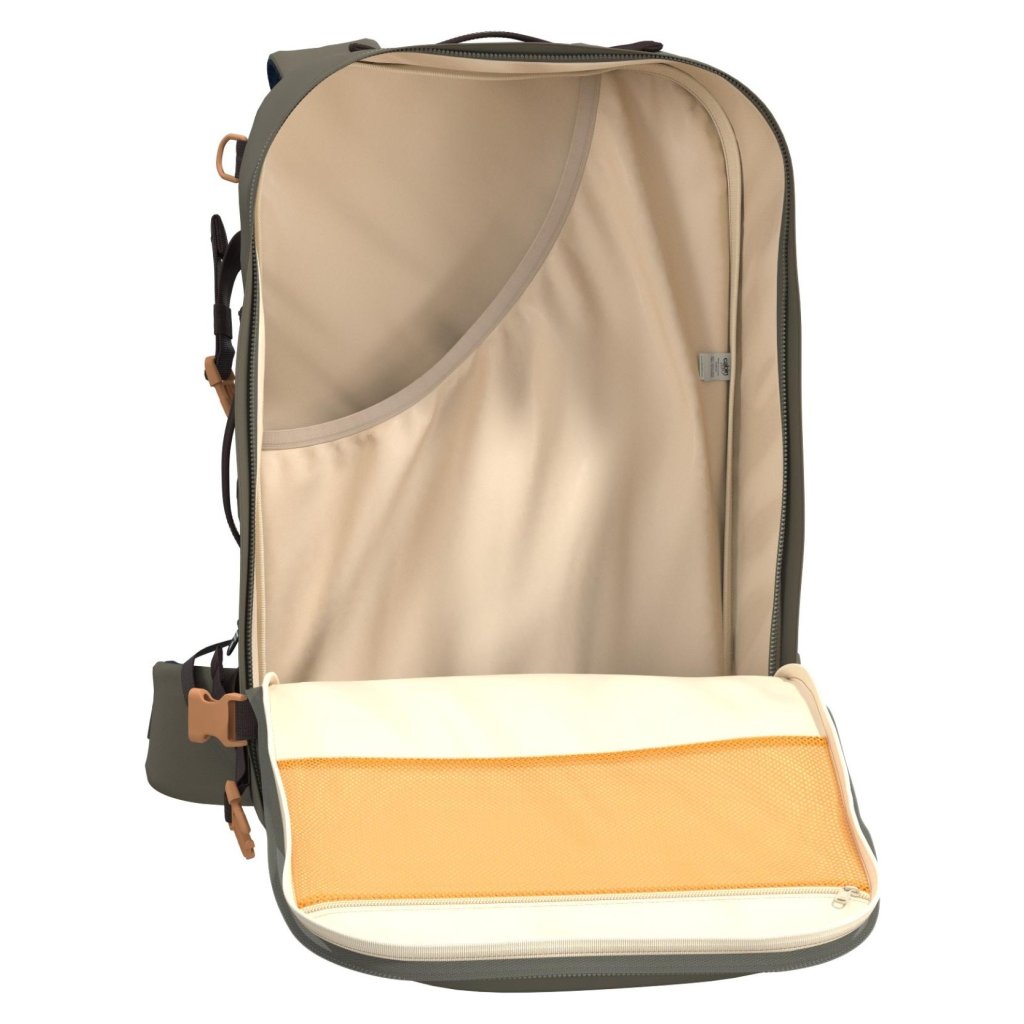 Batoh je vybaven praktickým vnitřním organizérem, uzamykatelnými zipy hlavní komory a chytrým řešením popruhů – ramenní popruhy i bederní pás lze během chvilky schovat do kapsy za zádovým panelem. Díky tomu se batoh snadno vejde do příručního prostoru a je ideální jako příruční zavazadlo.
