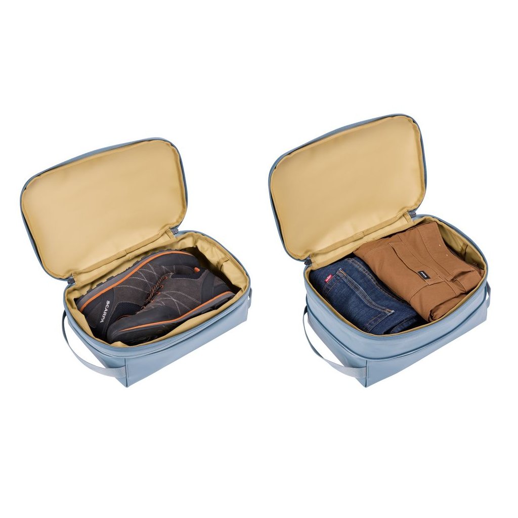 Kompresní zip umožňuje výrazně zmenšit objem uložených věcí a šetřit místo v kufru nebo batohu. Voděodolná plachtovina, potažené zipy a recyklované materiály bez PFC zajišťují ochranu obsahu i šetrnost k životnímu prostředí.