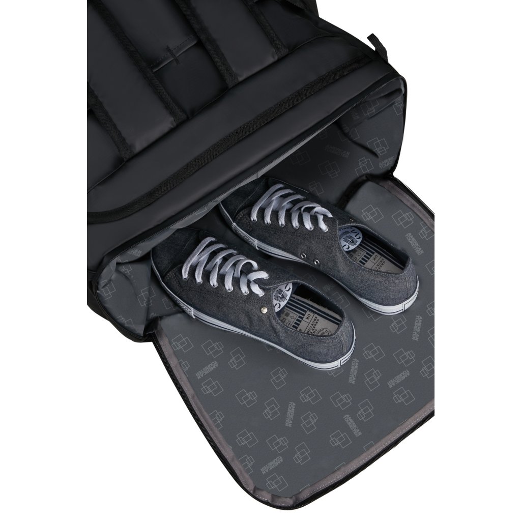 Vnitřní uspořádání zahrnuje prostorný hlavní úložný prostor, kapsu na boty pro oddělení obuvi od ostatních věcí a křížové popruhy, které udrží obsah tašky na místě i při pohybu.