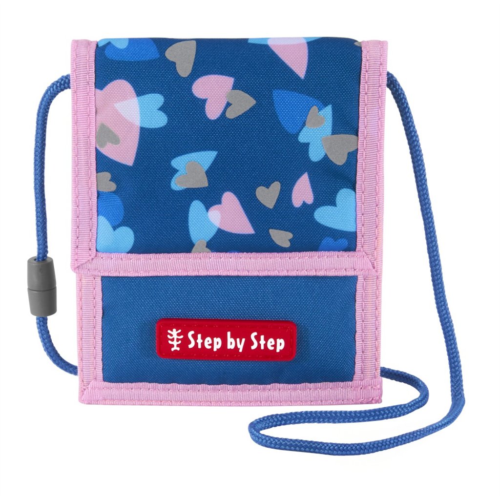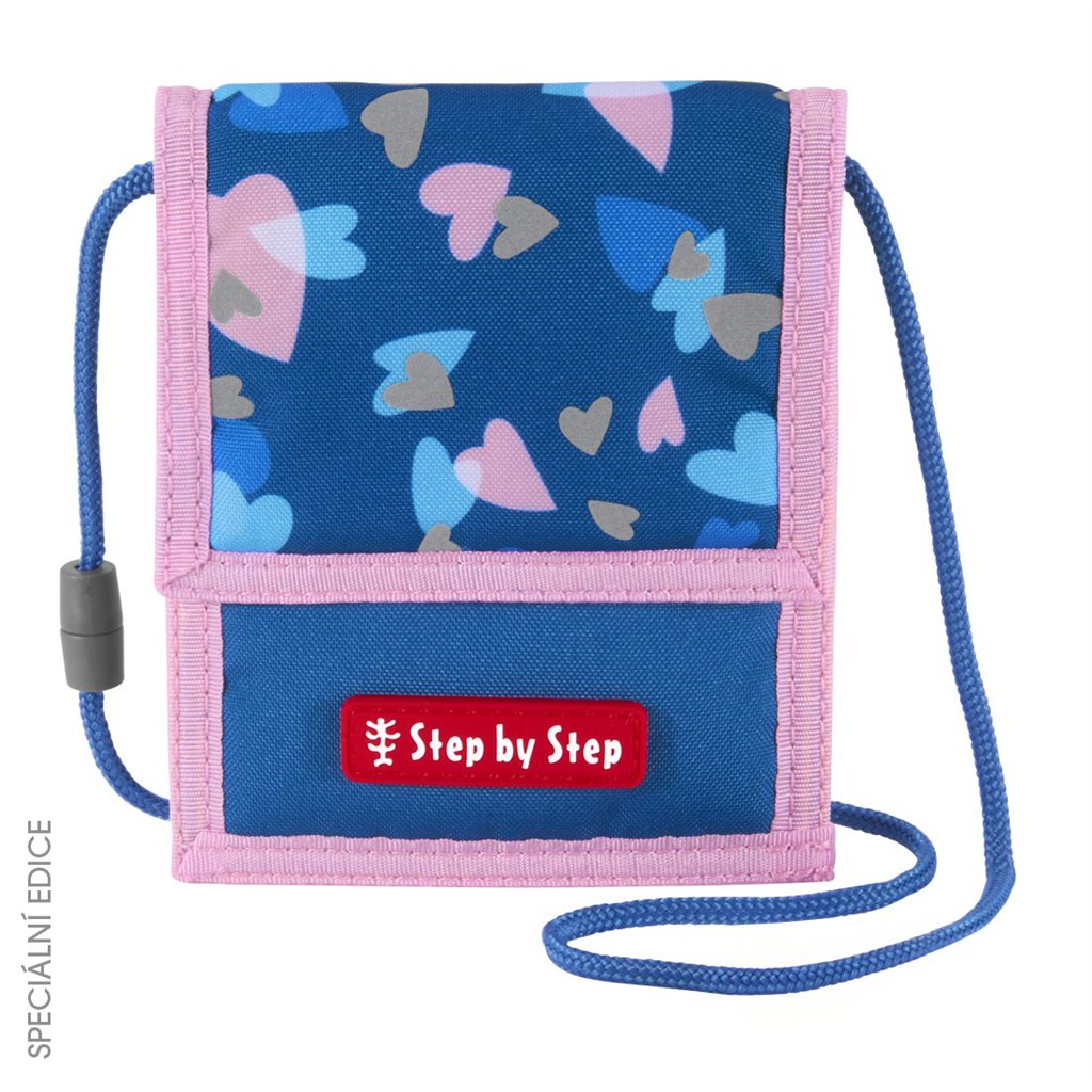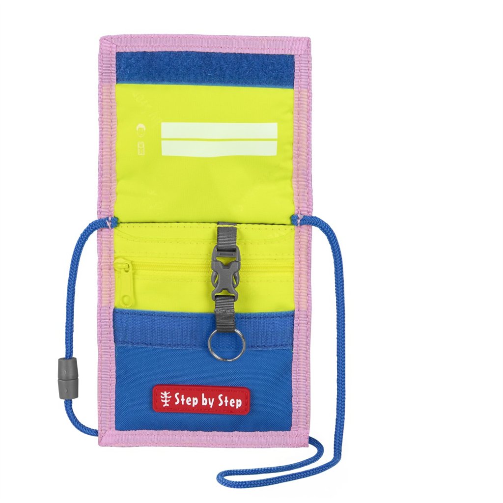 Šňůrka na krk je vybavena bezpečnostním uzávěrem, který se při zachycení automaticky otevře a zabrání poranění dítěte. Vnitřní uspořádání je přizpůsobeno dětským potřebám – kapsa na mince se zipem, velká přihrádka na bankovky, odnímatelný kroužek na klíče a průhledná zadní kapsa pro rychlé zobrazení průkazu nebo kartičky. Motiv Seashell Pearl ladí s designem školních aktovek a batohů značky Step by Step.
