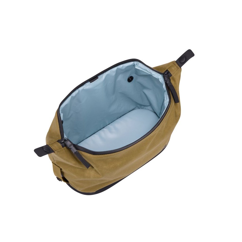 Voskovaná plátěná tkanina s PFC-free úpravou a hypalonové dno umožňují položit tašku kamkoliv bez obav z vlhkosti.