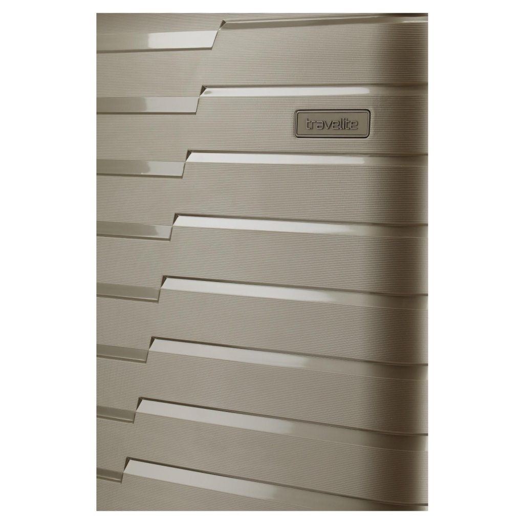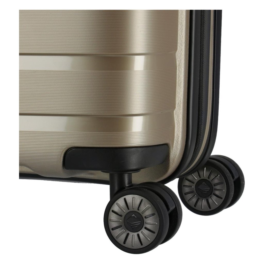 Čtyři velká dvojitá kolečka otočná o 360° zajišťují plynulý, tichý a stabilní pohyb. Povrchová úprava kombinuje lesklé i matné plochy s plastickým linkováním, které nejen chrání kufr proti poškrábání, ale zároveň mu dodává elegantní a prémiový vzhled.