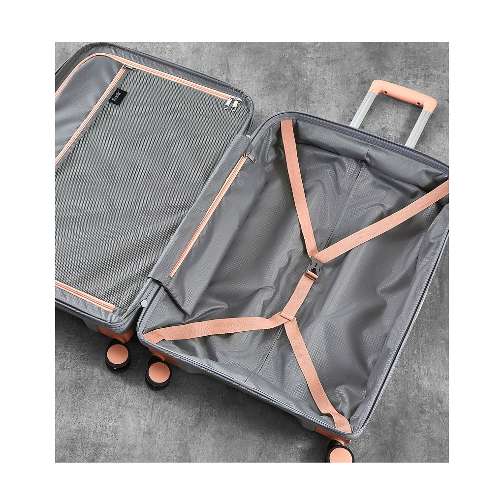 Kufr je uzavíratelný zipem, oba jezdce zipu se dají zapojit do TSA zapuštěného kódového zámku. U kufru lze pomocí druhého zipu zvětšit vnitřní objem. Horní madlo je plastové. Na zadní straně kufru je adresní štítek. Má lehký teleskopický výsuvný systém, prostor na víku oddělený textilní přepážkou, vnitřní kapsy a jistící popruhy.