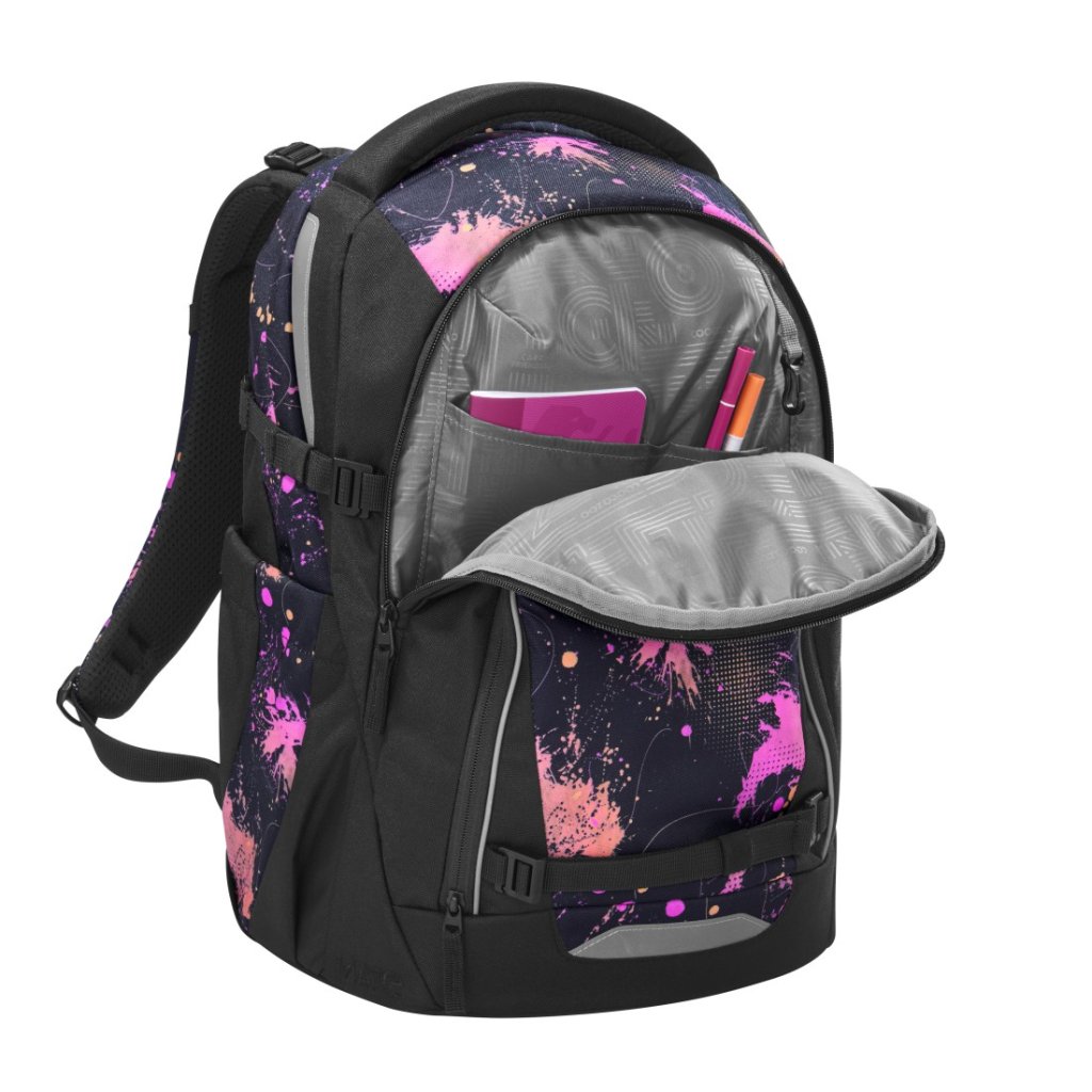 Vnitřní uspořádání batohu nabízí dostatek místa pro učebnice, sešity i každodenní výbavu. Hlavní přihrádka s integrovanou částí na knihy je umístěna blízko zad, což pomáhá s lepším rozložením hmotnosti.