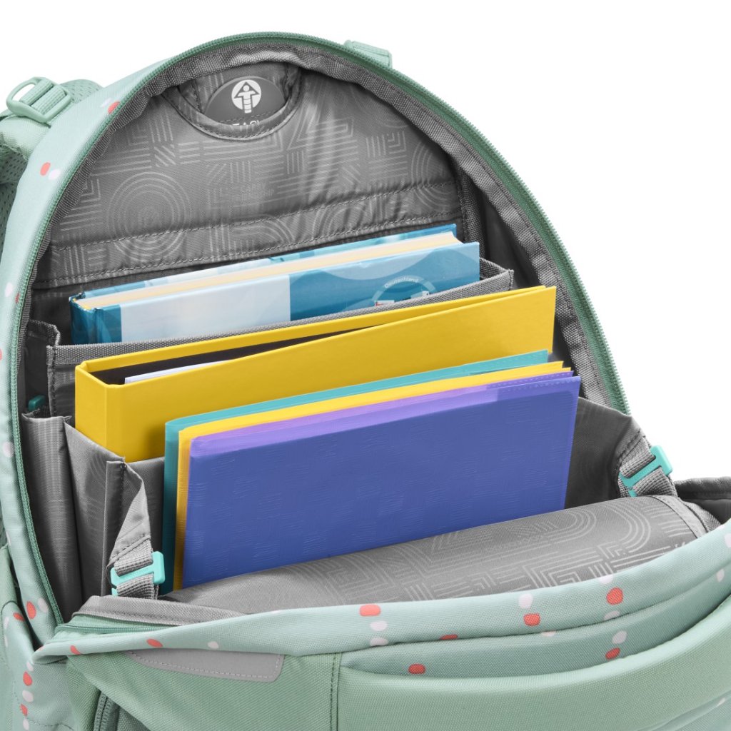 Vnitřní uspořádání batohu nabízí dostatek místa pro učebnice, sešity i každodenní výbavu. Hlavní přihrádky s integrovanou částí na knihy jsou umístěny blízko zad, což pomáhá s lepším rozložením hmotnosti.