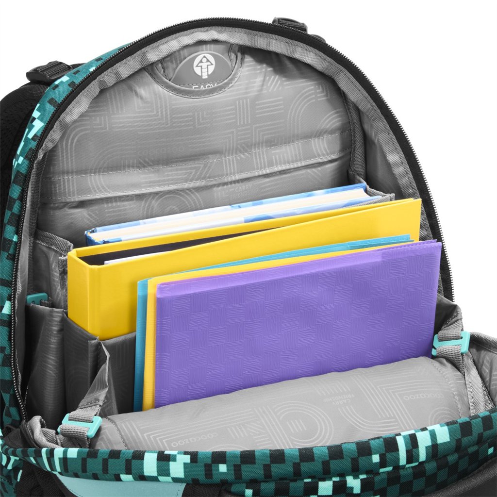 Vnitřní uspořádání batohu nabízí dostatek místa pro učebnice, sešity i každodenní výbavu. Hlavní přihrádka s integrovanou částí na knihy je umístěna blízko zad, což pomáhá s lepším rozložením hmotnosti.