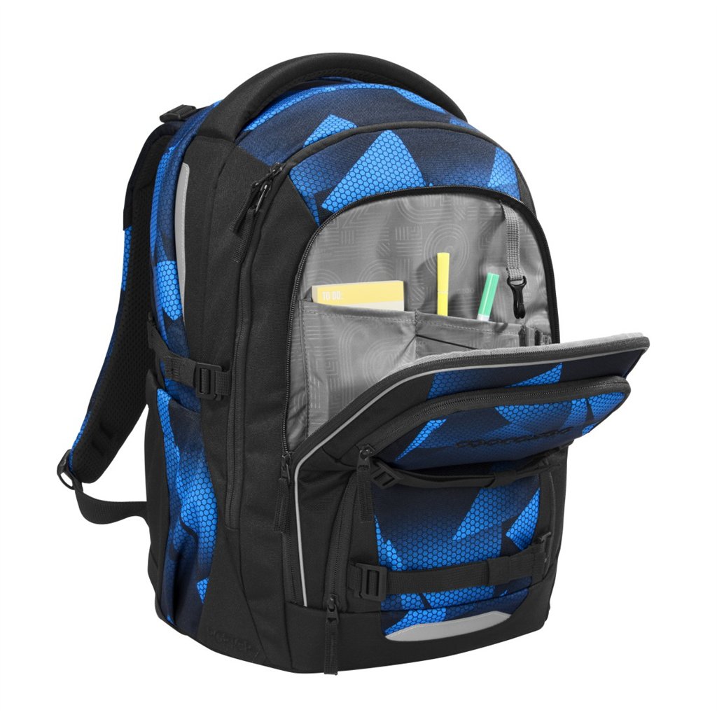 Vnitřní uspořádání batohu nabízí dostatek místa pro učebnice, sešity i každodenní výbavu. Hlavní přihrádky s integrovanou částí na knihy jsou umístěny blízko zad, což pomáhá s lepším rozložením hmotnosti.