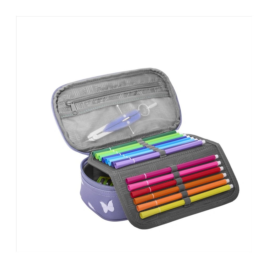 Součástí penálu je malé pravítko a trojúhelník s úhloměrem. Vnitřní prostor je vybaven 21 poutky na pera a tužky, poutky na malé pravítko a všitou kapsou pro trojúhelník. Ve víku se nachází kapsa na zip pro drobné předměty a průhledná přihrádka například na rozvrh hodin. Vnitřní klopa se uzavírá na suchý zip a celý penál je bezpečně uzavřen kvalitním zipem. Penál má reflexní potisk.