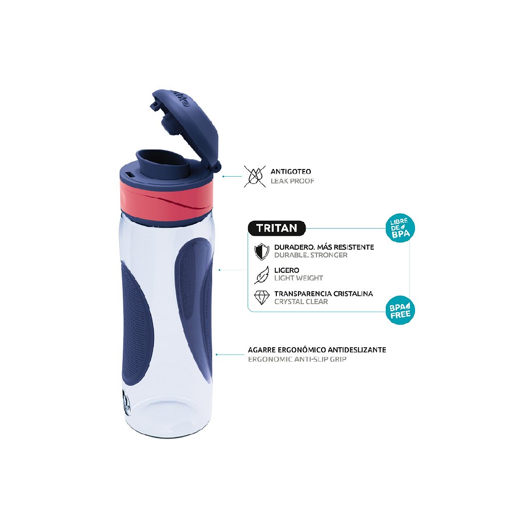 Láhev má široké hrdlo, díky němuž se snadněji čistí. Můžete do láhve vložit jak kousky ovoce, tak kostky ledu. Láhev jednoduše otevřete jednou rukou pouhým stlačení z obou stran.