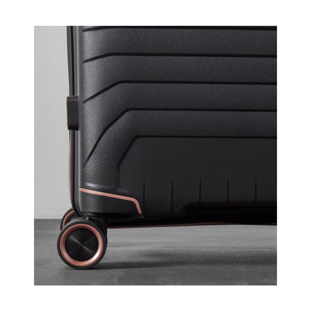 ROCK Astrid M přináší ideální poměr velikosti, hmotnosti a odolnosti. Skořepina z polypropylenu (PP) spolehlivě vzdoruje nárazům, TSA kódový zámek usnadní letištní kontroly a expandér umožní navýšit kapacitu o +10–15 %. Plynulý přesun zajišťují 4 dvojitá kolečka 360°, přehledný interiér s přepážkou, kapsami a kompresními popruhy urychlí balení i orientaci během cesty.