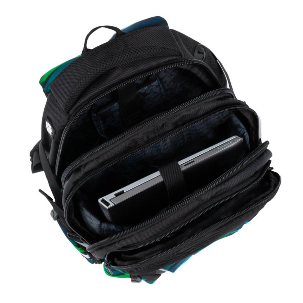 - Do hlavní komory se vejdou velké desky, sešity formátu A4 a v polstrované kapse je místo na tablet nebo notebook s úhlopříčkou až 15”. V horní části je popruh na suchý zip, kterým školák uvnitř laptop pevně přichytí.