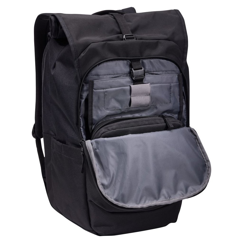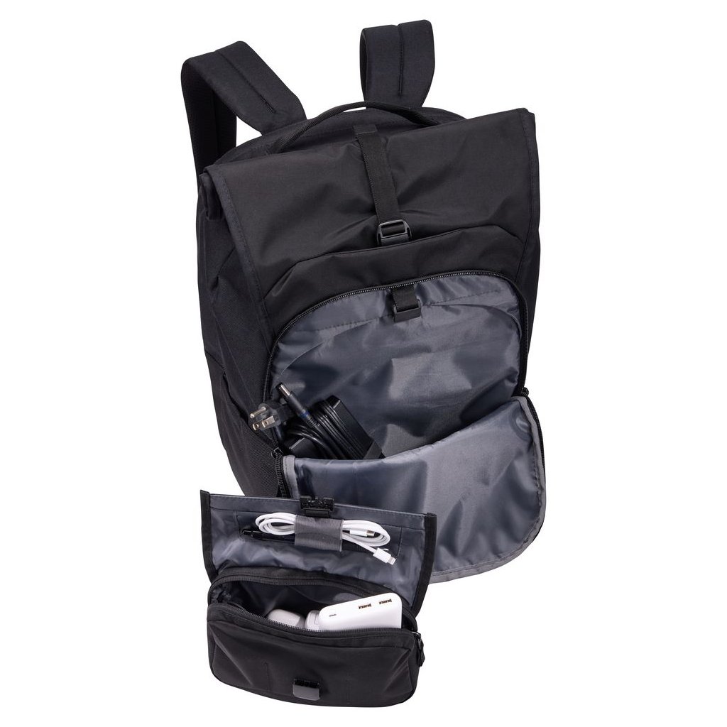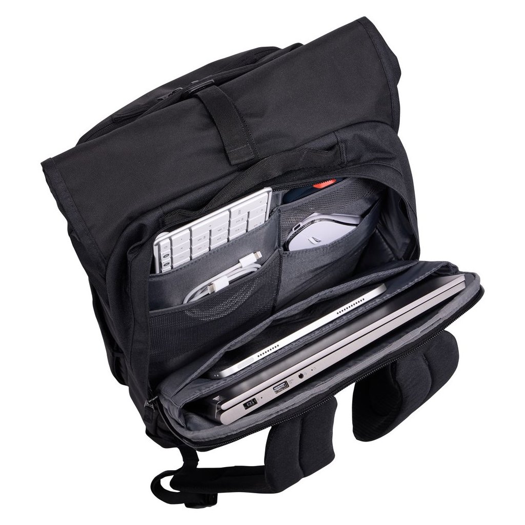 Samostatný pracovní oddíl pojme notebook až do velikosti 17", tablet, klávesnici, myš a příslušenství. Rolovací horní část umožňuje snadné navýšení kapacity batohu z 28 na 33 litrů podle aktuálních potřeb. Součástí je také vyjímatelné pouzdro, které slouží jako organizér drobné elektroniky a lze jej pohodlně přenášet samostatně mezi domovem a kanceláří.
