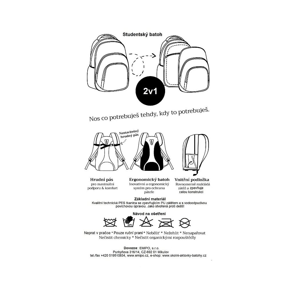 Dvoudílný studentský batoh 2v1 HADER, který je čtyřkomorový. Dvoudílný (2v1) znamená, že zip u druhé komory lze úplně rozepnout a tím se batoh rozdělí na dva, nebo se rozepne jen z části a poté slouží jako čtyřkomorový batoh.