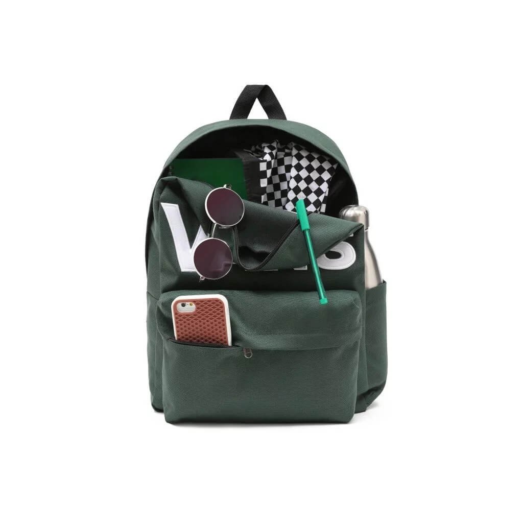 Batoh Vans Old Skool Drop V má jednu velkou hlavní přihrádku a má také přední kapsu na zip s organizérem pro rychlý přístup a kapsu na láhev s vodou. Logo Vans je na přední straně a rovně střižené polstrované ramenní popruhy dodávají této tašce extra pohodlí.