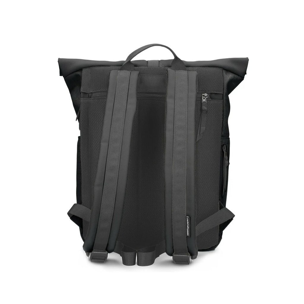 Záda batohu jsou vyměkčená a současně zpevněná, takže batoh dobře drží tvar i při plném zatížení. Pohodlí při nošení zajišťují nastavitelné polstrované ramenní popruhy a pevné horní ucho pro nošení v ruce. Horní část lze sepnout magnety skrytými v materiálu, srolovat a upevnit pomocí popruhu s kovovou přezkou. Do batohu se dostanete také praktickým bočním zipem, i když je srolovaný.