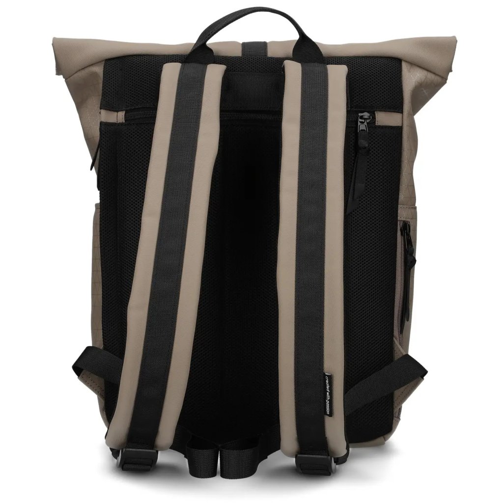 Záda batohu jsou vyměkčená a současně zpevněná, takže batoh drží tvar i při plném zatížení. O komfort při nošení se starají nastavitelné a polstrované ramenní popruhy a pevné horní ucho umožňuje pohodlné přenášení v ruce. Horní část batohu lze sepnout dvěma magnety skrytými v materiálu, srolovat a upevnit pomocí popruhu s kovovou přezkou. Do batohu se snadno dostanete také praktickým bočním zipem.