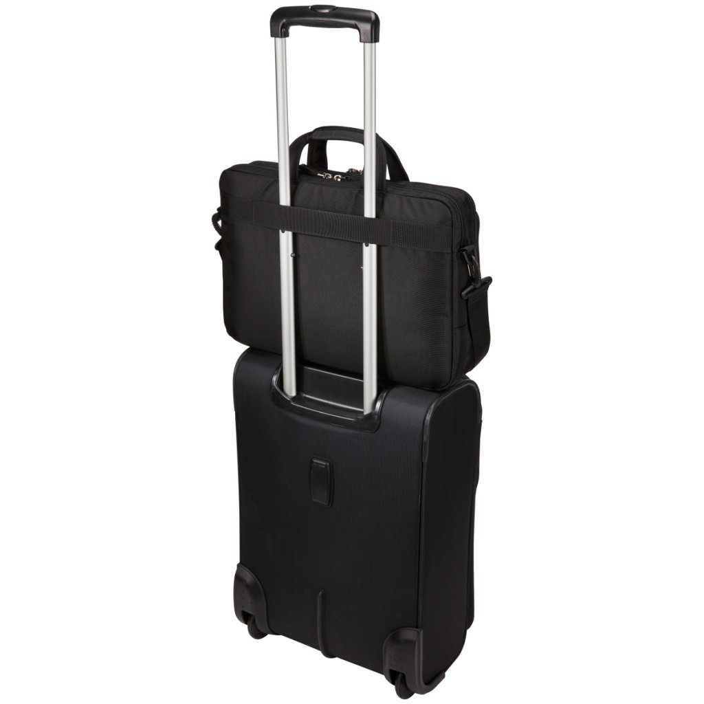 Polstrovaný organizér nabízí množství kapes pro drobnou elektroniku, kabely, vizitky i klíče. Komfort při nošení zajišťují tvarovaná polstrovaná ucha, která lze sklopit, a nastavitelný odnímatelný ramenní popruh s výstelkou. Tichá PU táhla zipů eliminují nežádoucí hluk při pohybu. Praktický průchozí popruh umožňuje připevnění tašky na teleskopické madlo kufru, což oceníte zejména při cestování.
