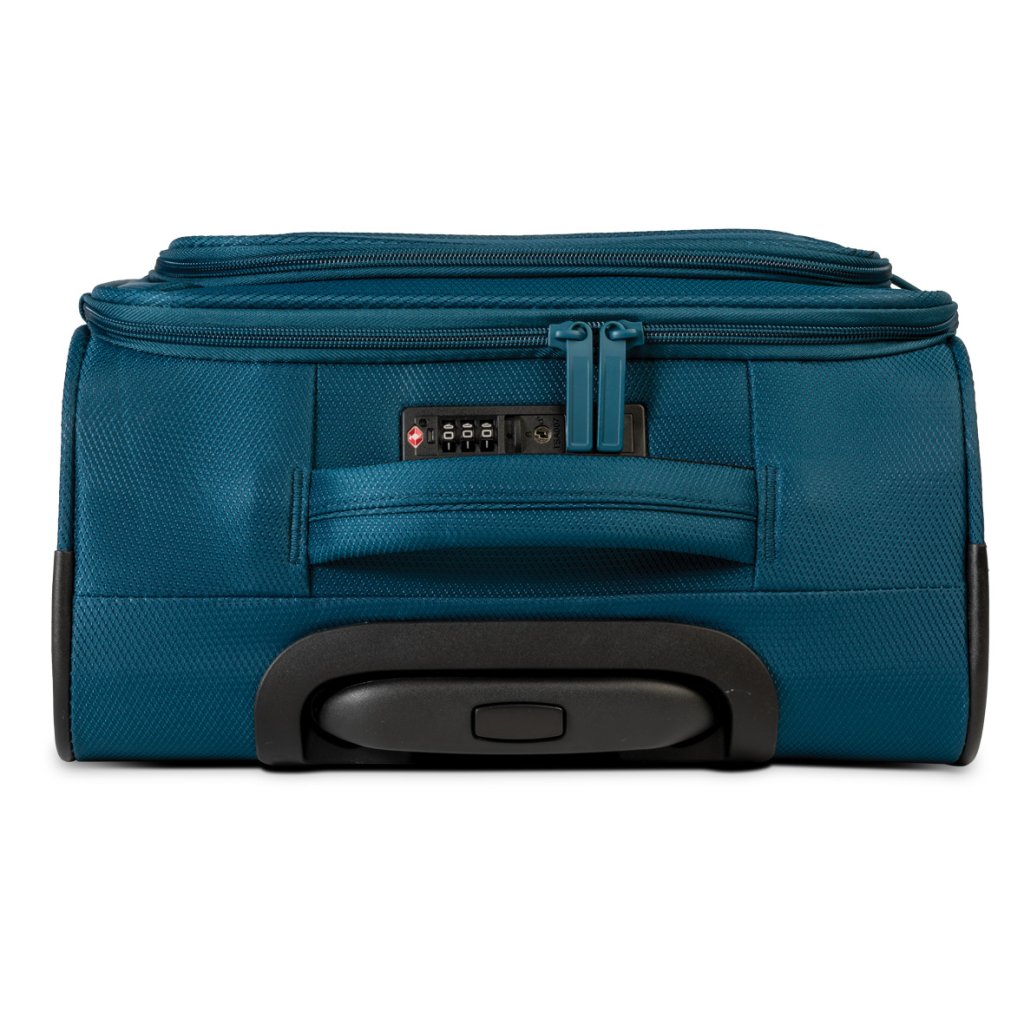Kufr je vyroben z pevného 400D polyesteru, který je odolný proti mechanickému opotřebení a běžným nárazům při manipulaci. Konstrukci doplňuje stabilní spodní ochrana, hliníkové výsuvné madlo a praktická horní i boční madla pro snadné přenášení.